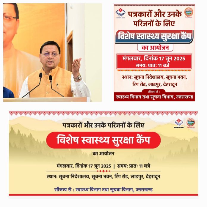देहरादून । उत्तराखण्ड में पत्रकारों और उनके परिजनों के स्वास्थ्य की चिंता को लेकर राज्य सरकार बेहद गम्भीर है। मुख्यमंत्री पुष्कर सिंह धामी के निर्देश पर, मंगलवार 17 जून को सूचना निदेशालय, रिंग रोड, देहरादून में एक विशेष नि:शुल्क स्वास्थ्य सुरक्षा कैम्प का आयोजन किया जा रहा है।यह कैम्प स्वास्थ्य विभाग व सूचना विभाग के संयुक्त प्रयास से प्रातः 11 बजे से शुरू होगा।