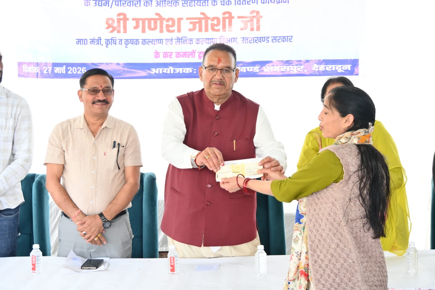 कैबिनेट मंत्री गणेश जोशी ने आज मसूरी विधानसभा क्षेत्र के अर्न्तगत किमाड़ी में आपदा प्रभावित उद्यमियों को बड़ी राहत देते हुए ग्रामोत्थान (रीप) परियोजना के तहत विकासखण्ड सहसपुर के विभिन्न गांवों के 63 परिवारों को रुपये 60 लाख से अधिक की सहायता राशि के चौक वितरित किए गए।